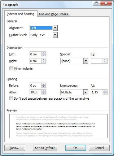 Bạn có thể thay đổi cách bố trí mặc định của văn bản như căn lề, khoảng cách giữa các đoạn, các hàng... bằng cách nhấn tổ hợp phím Alt-O, rồi nhấn tiếp phím P để mở hộp thoại Paragraph.