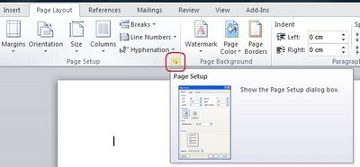 Tiếp theo, mở tab Page Layout, nhấn vào biểu tượng mũi tên (nằm ở góc phải của Page Setup), để mở hộp thoại Page Setup.