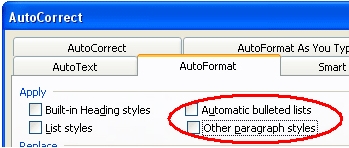 Trong MS Word, bạn vào menu Tools, bấm chọn thẻ Autocorrect Options. Khi xuất hiện hộp thoại, bạn chọn thẻ AutoFormat rồi bỏ dấu chọn trước hai mục Automatic bulleted lists và Other paragraph styles.